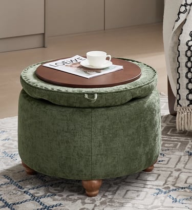 This large tufted ottoman in a cottagecore-inspired homey design features a reversible tray top for maximum flexibility. It comes in several colors in linen and chenille. This tufted ottoman also offers a reversible tray and comes in several colors; I'd choose the light blue or green. Currently 25% off.