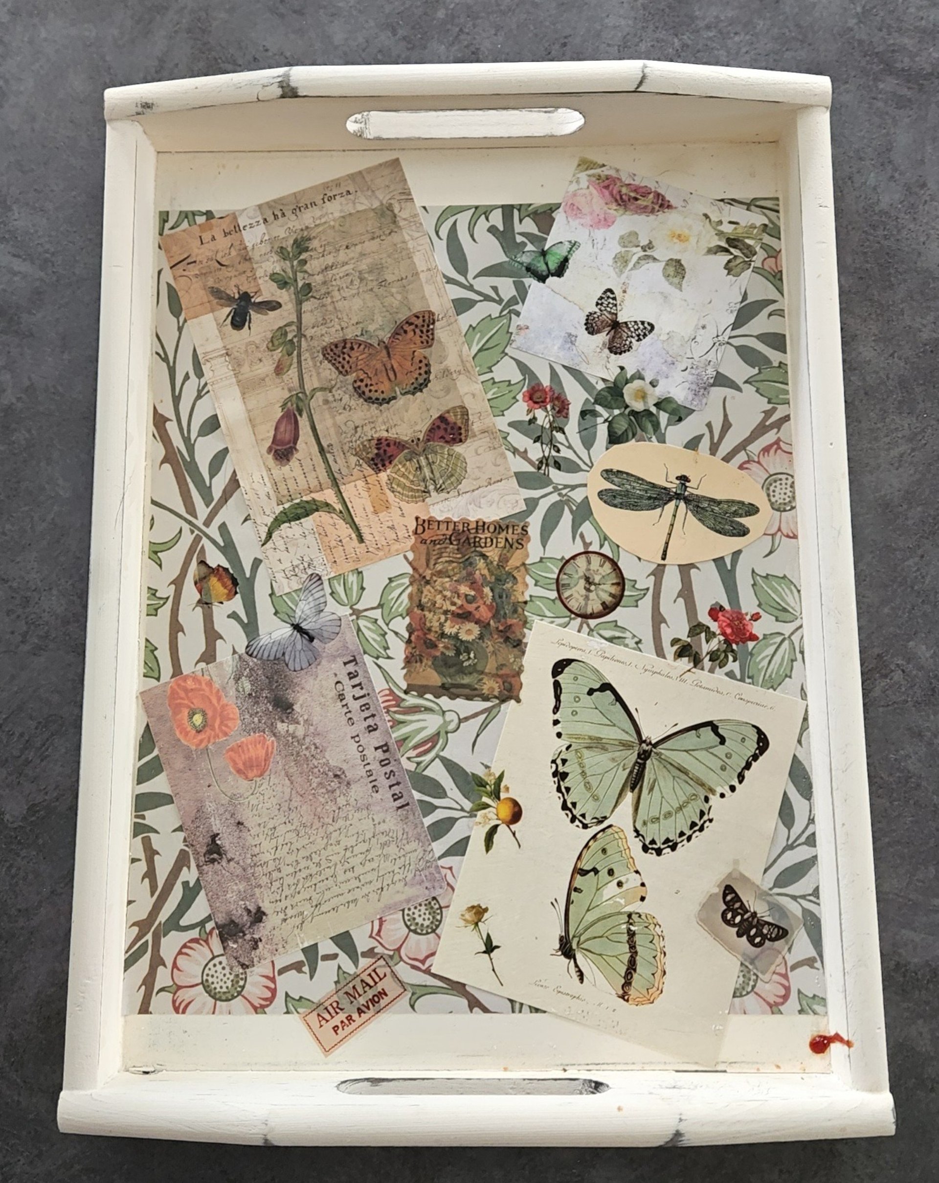Can’t find what you’re looking for or wish to create something unique for a low cost? I’ve created at least six custom trays I use all over my home with vintage sun tarot art and vintage butterfly art I’ve printed out, a William Morris print, and decoupage collages using interesting vintage style papers, stickers, and maps—generally for a total cost of less than $10 and in four to five easy steps. Here are the directions: